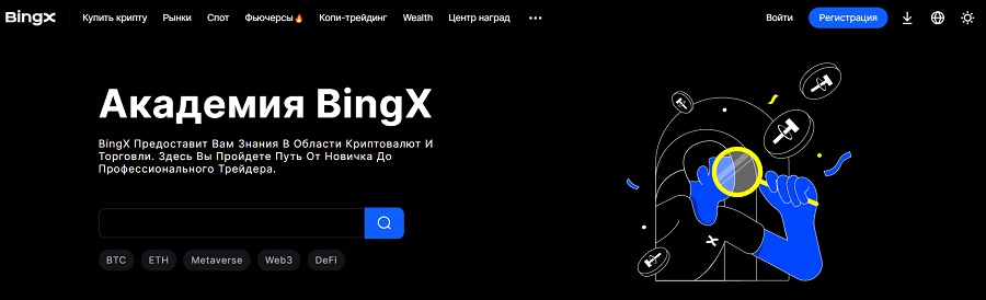 BingX Academy — это академия с прикладным уклоном. Она подойдет тем, кто хочет учиться на примерах, по видео и в реальном интерфейсе, а не по теории. Здесь большое внимание уделено копитрейдингу — пользователи могут буквально «повторять» действия профессиональных трейдеров.