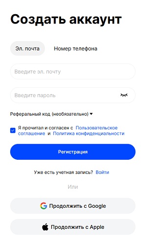 - Выберите способ регистрации: через email или номер телефона.