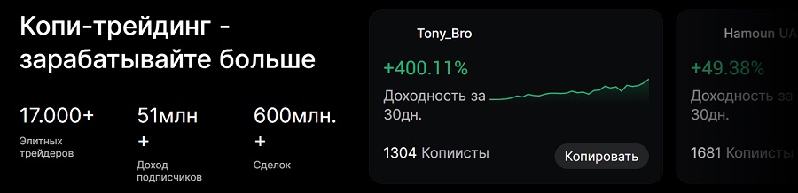 - Копи-трейдинг — уникальная социальная торговая функция, позволяющая автоматически копировать сделки топовых трейдеров с проверенной историей успешности. Система рейтингов помогает выбрать наиболее прибыльных мастер-трейдеров.